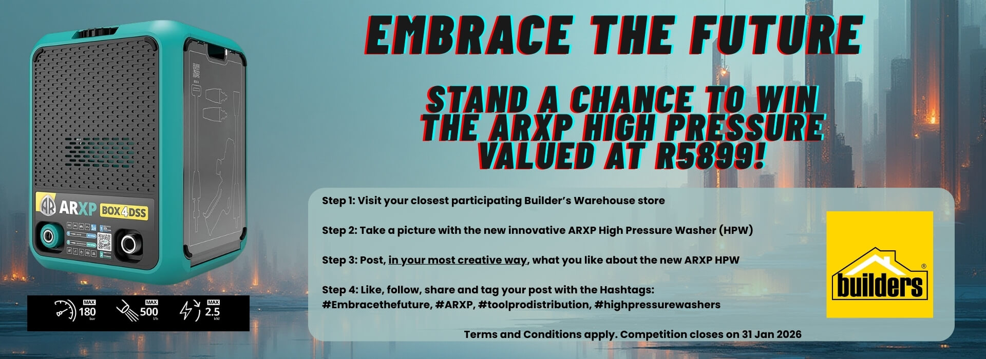 Entry Method: Participants will need to visit their closest Builder’s Warehouse (that stocks the product), take a picture/video with the new innovative HPW from ARXP and tell us in the most creative way what they like about the new innovative ARXP High Pressure Washer. They will need to share this post and tag the relevant socials (TPD and BWH)